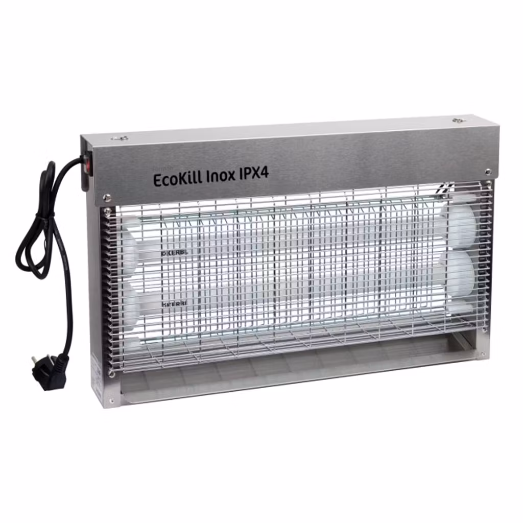 Den elektriska flugfångaren Eco Kill Inox IPX4 är en högkvalitativ lösning med ett rostfritt hölje, designad för effektivitet och hållbarhet. Alla Eco Kill Inox-modeller är TÜV-GS testade och har långlivade UV-lampor. Höljet med matt finish är enkelt att rengöra och behåller sin elegans under många år. Den tunna designen och det exponerade nätet ökar fångeffektiviteten. Med stänksäker elektronik och IPX4-certifiering är denna modell idealisk för användning i stallar, utomhus eller andra fuktiga miljöer.
