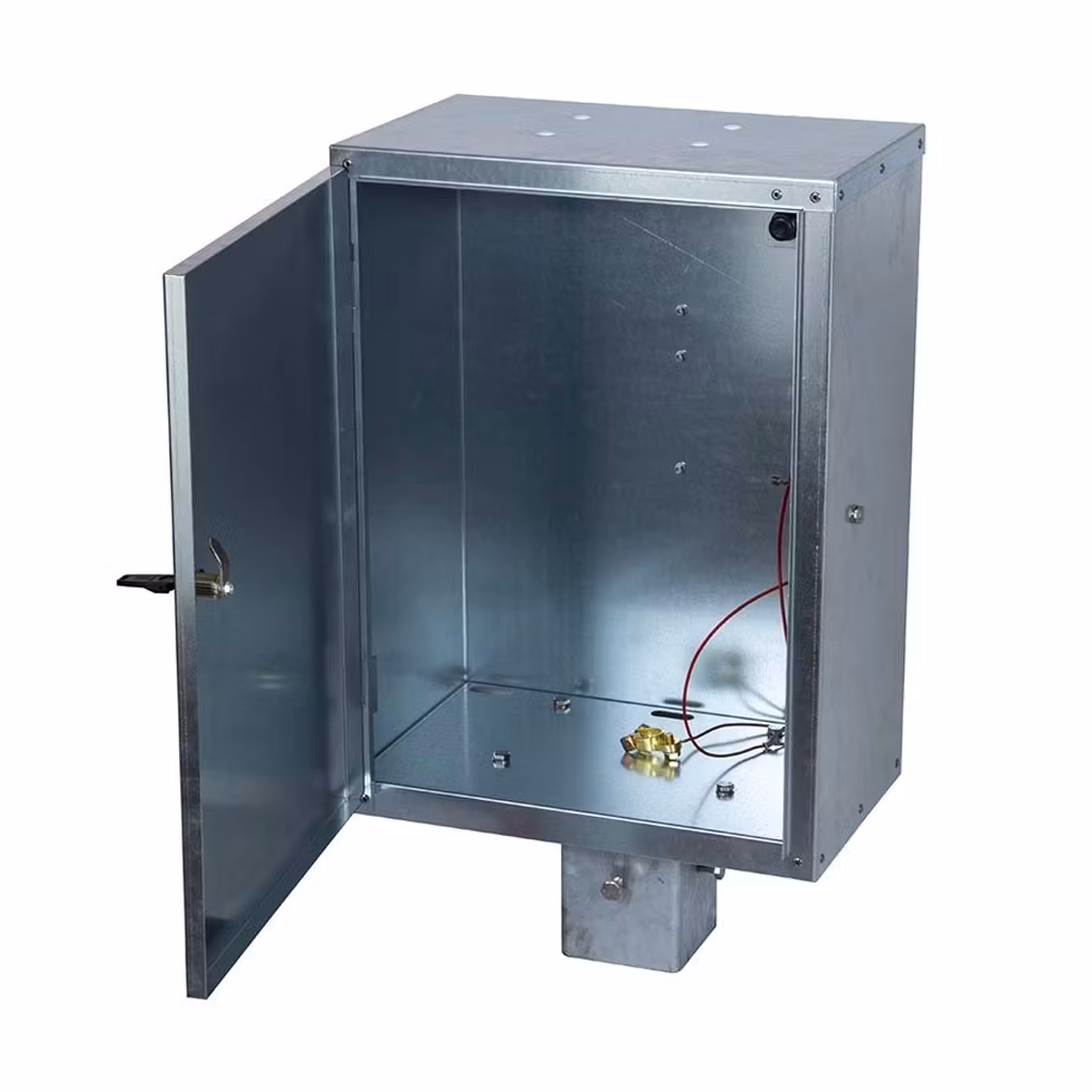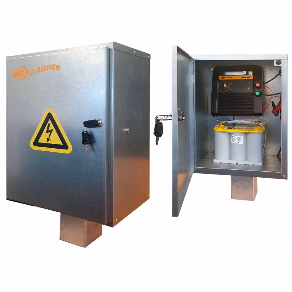 - Galvaniserad låda som skyddar batteri och stängselenheter från vandaler eller stöld